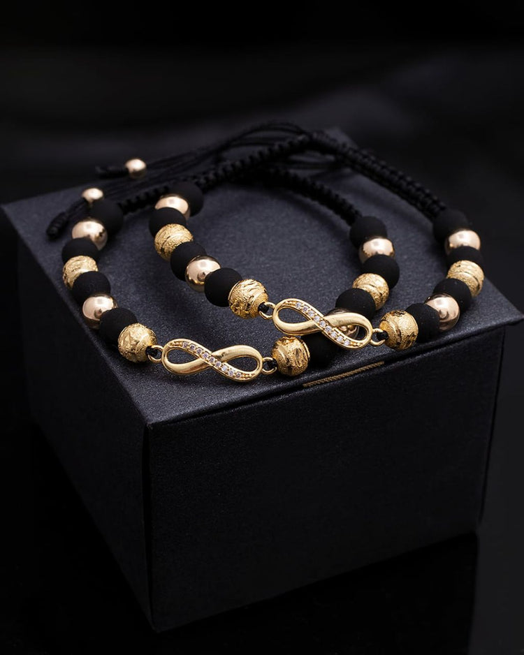 Manillas de pareja con herraje infinito, balines lisos y diamantados de 6mm de Oro Laminado 18k